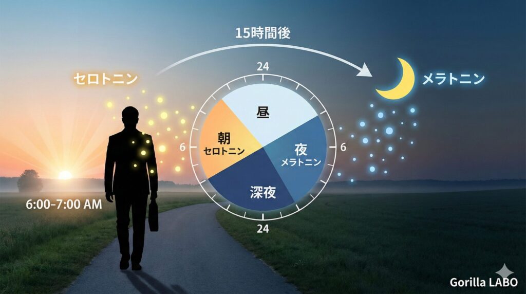 【休日朝の1時間ウォーキング】 休日の朝、6:00に起床したら、7:00から1時間のウォーキングを行います。これは運動強度を上げるためではなく、朝日を浴びることでセロトニン(幸福ホルモン)を分泌させ、15時間後(夜22:00)に自然な眠気を誘発するメラトニンに変換させるためです。