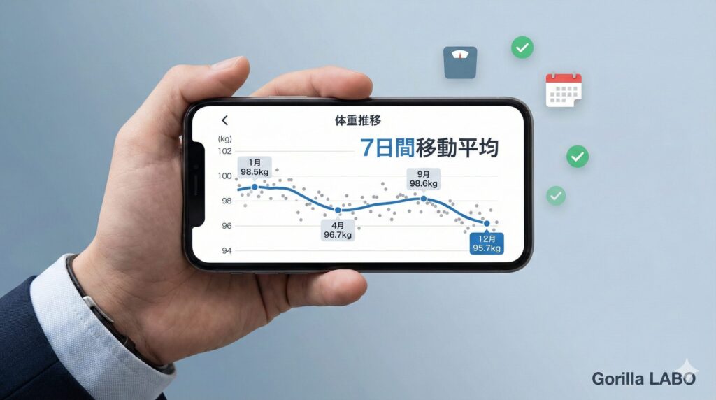 私の実際のグラフを見ると、4月に96.7kg、9月に98.6kgまで戻りましたが、10月からのシステム化により、12月には95.7kgまで下がっています。この「大きなトレンド」を見ることで、日々のノイズに振り回されなくなりました。