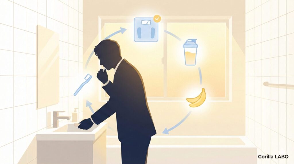 AM6:00に目が覚める → トイレに行く → 体重計に乗る → プロテインを飲む → バナナを食べる。この一連の流れは、もはや「やる気」を必要としません。朝起きたら自動的に体が動くのです。