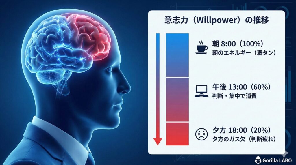 心理学者ロイ・バウマイスターの研究によれば、私たちの意志力は「筋肉」に似ています。使えば使うほど疲弊し、やがて枯渇します。この現象は「自我の枯渇(Ego Depletion)」と呼ばれ、1日に約35,000回もの判断を行う現代人にとって、避けられない生理現象なのです。