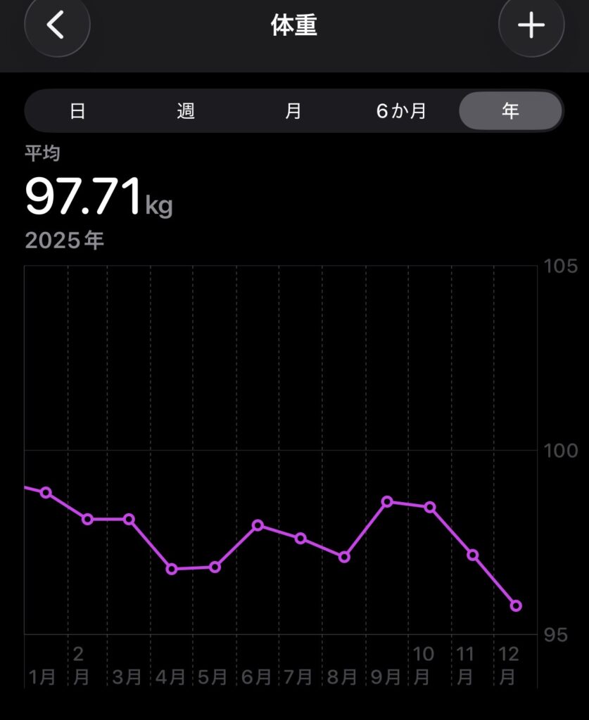 実際、私の体重推移を見ると、1月98.5kg → 12月95.7kg で、約2.8kgの減量です。途中で転職という大きな環境変化があり、9月には98.6kgまで戻りましたが、システムが機能しているため、再び下降トレンドに戻りました。